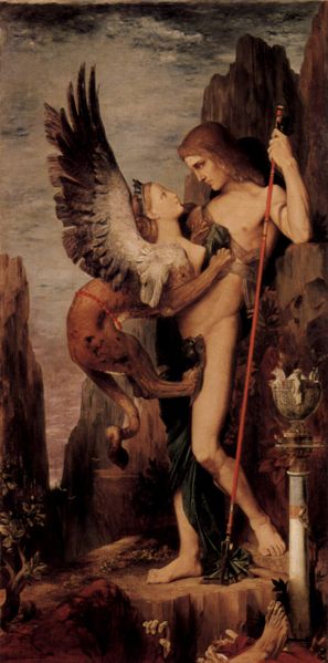 Chegando à Tebas, deparou com a Esfinge, monstro que vinha assolando a cidade há tempos. Descendente de uma família de monstros, sua mãe, Equidna, corpo de mulher e cauda de serpente que devorava todos os viajantes que dela se aproximassem. Ortro uniu-se a própria mãe, e dessa forma, tornou-se ao mesmo tempo pai e irmão da Esfinge. Esta havia sido enviada por Hera à cidade de Tebas para punir o rei Laio, responsável pelo suicídio de Crísipo, filho de Pélops. Misto de vários animais, a Esfinge tinha a cabeça e o busto de mulher, as patas de leão, o corpo de cão, cauda de dragão e asas como as das Hárpias.